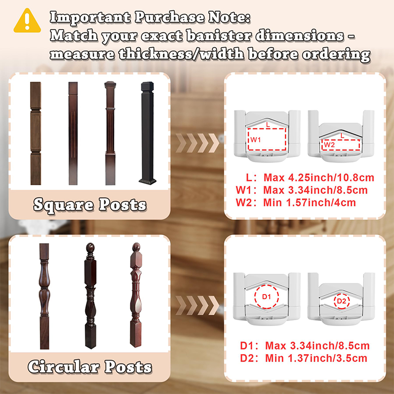 Round/Square Banister Mounting Kit: Suitable for Round Posts ranging from 1.37'' to 3.94'' in diameter, Square Posts ranging from 1.57'' to 3.94'' wide. Making them suitable for retractable baby gates, mesh gates, iron gates and more
