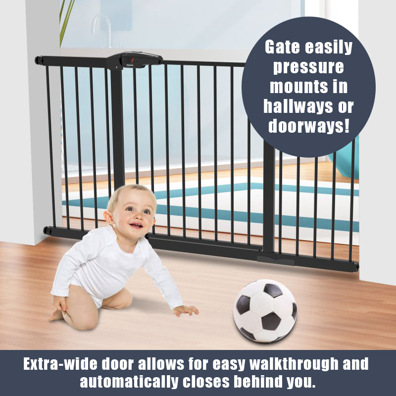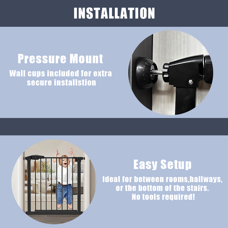 This gate supports pressure-mounted installation for tool-free, damage-free setup—ideal for high-traffic or stairway areas.