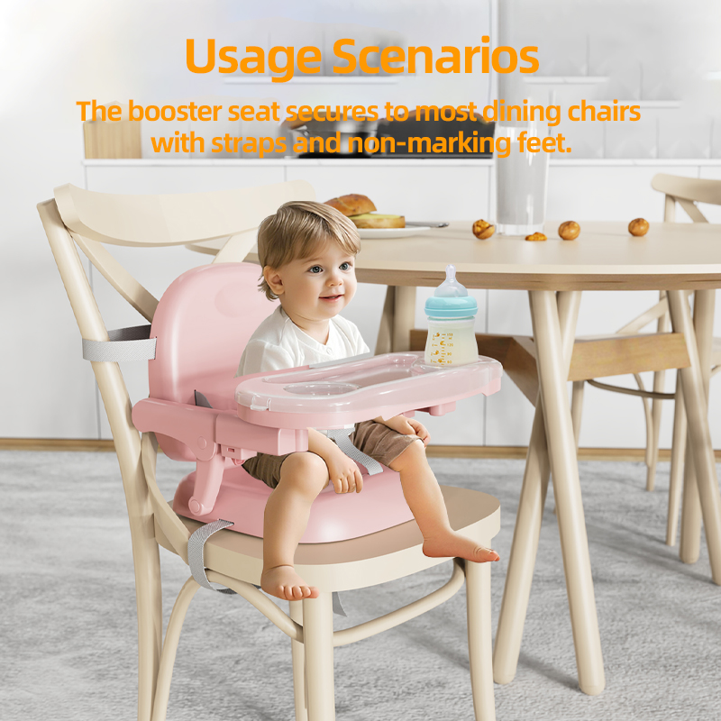 Booster Seat: Securely attaches to most dining chairs with reinforced straps and non-slip feet.