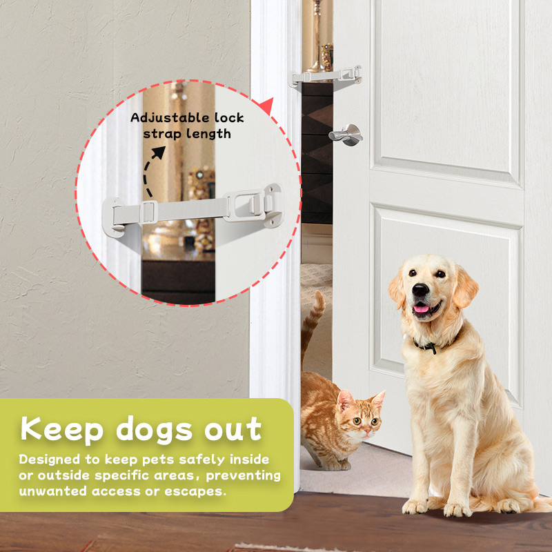 1.Adjustable & Secure Design The lock strap length is fully adjustable to fit most door gaps, ensuring a snug, wobble-free hold.Two lock button types (Type A & B) offer flexible operation, while the reinforced strap resists pulling from active pets.