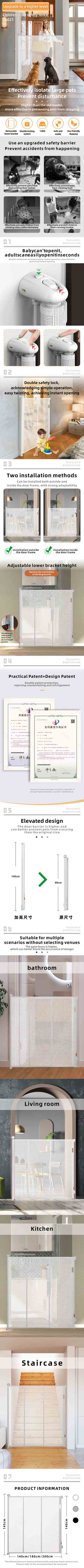 The Prodigy Extra-Tall Safety Gate is an innovative barrier solution designed to provide superior safety and convenience for households with pets and young children.  With its elevated height, double-locking system, and versatile installation options, this gate effectively prevents climbing, accidental access, and unwanted intrusions while ensuring ease of use for adults.
