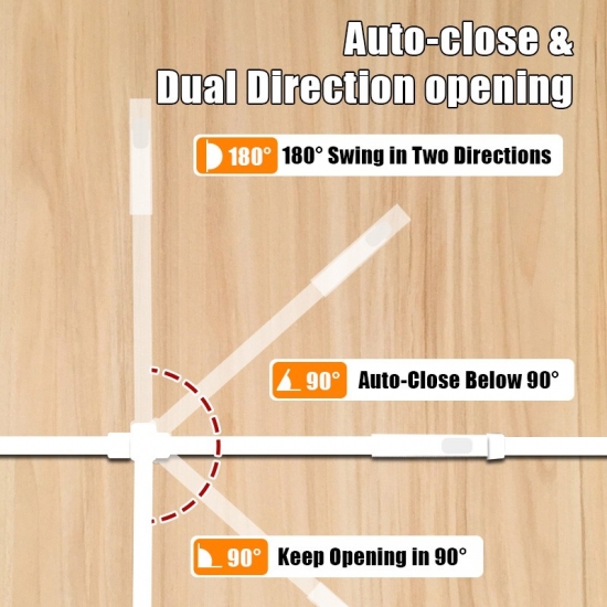 Auto-close & dual-direction opening: 180° swing in both directions; automatically closes when opened less than 90°, and stays open at 90° for convenience.