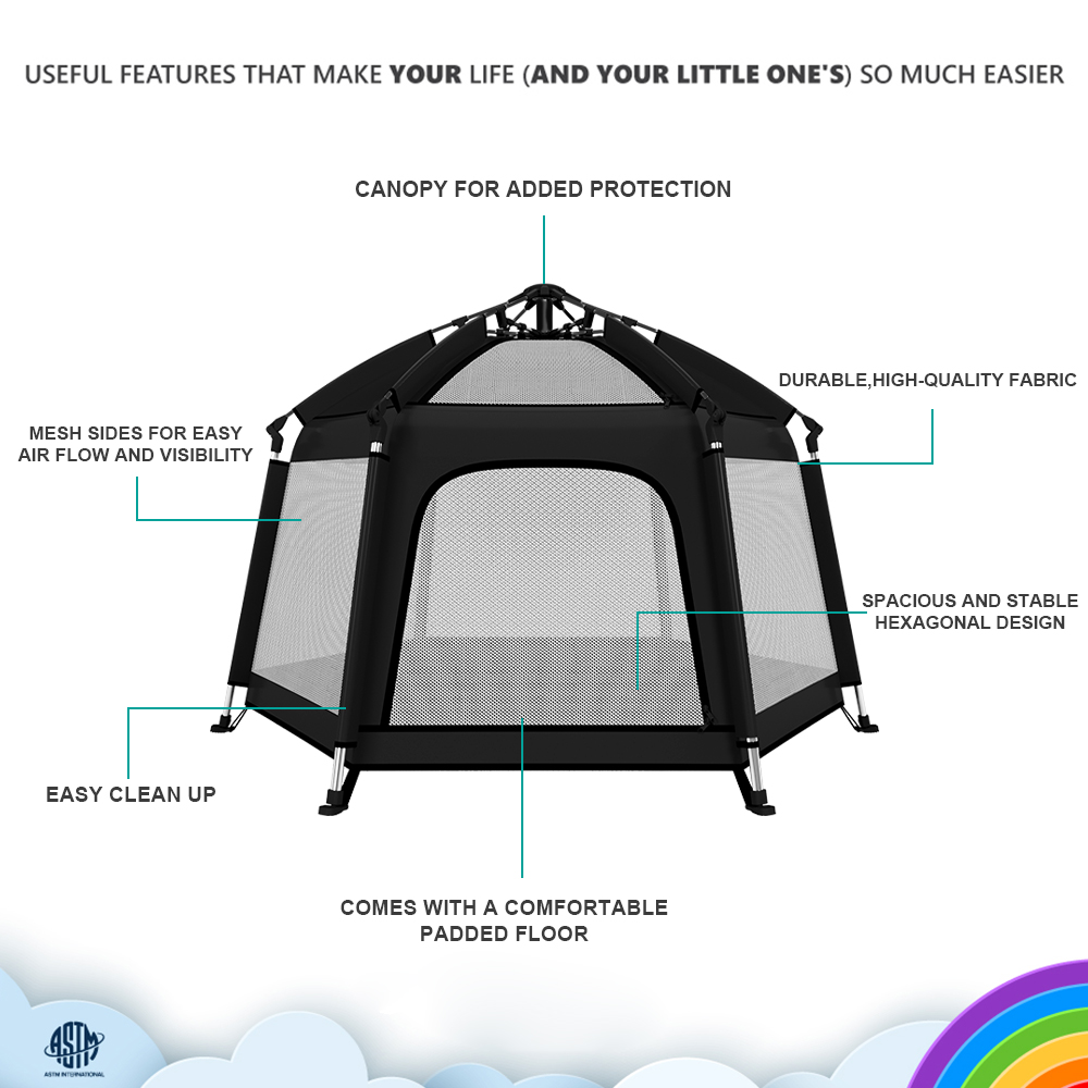 - 【UPF50+ UV Canopy, Excellence in Detail】This indoor/outdoor play yard comes with a UPF50+ UV canopy to protect kids from UV in the outdoors. Breathable mesh, dual doors, top ventilation openings for comfort and breathability, and allowing you to keep an eye on your little explorer.