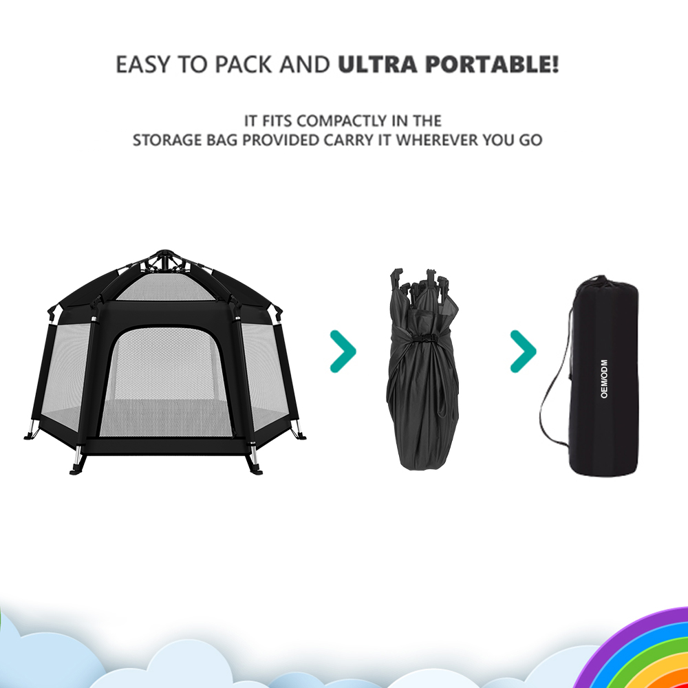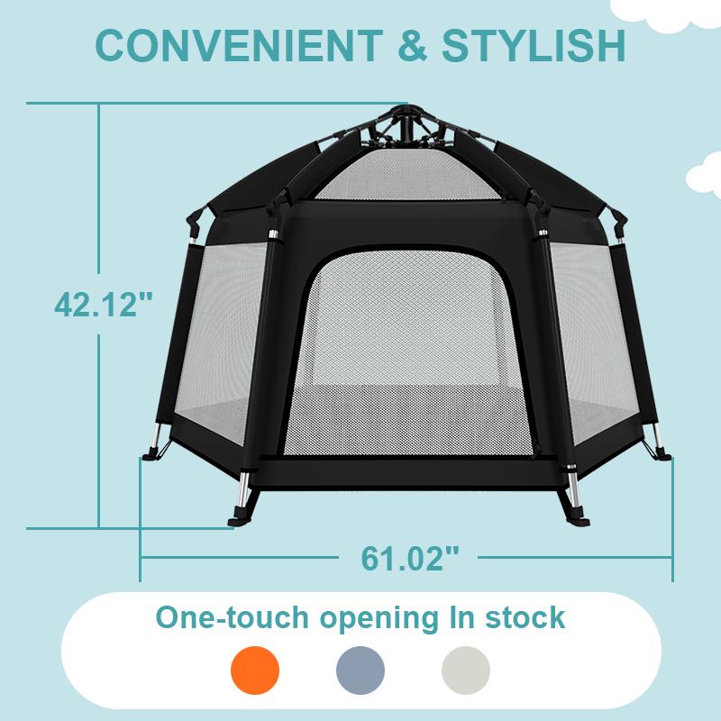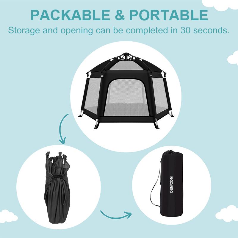 - 【Spacious Space & Portable】Baby play yard measures 57.08" W x 42.12" H, providing babies with plenty of room for crawling, exploring, sleeping and gatherings! The toddler play tent folds up to only 28.74" H x 8.66" W, and with a storage bag, portable for outdoors and storage.
